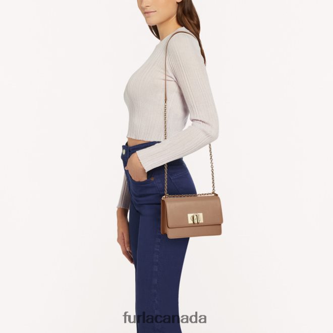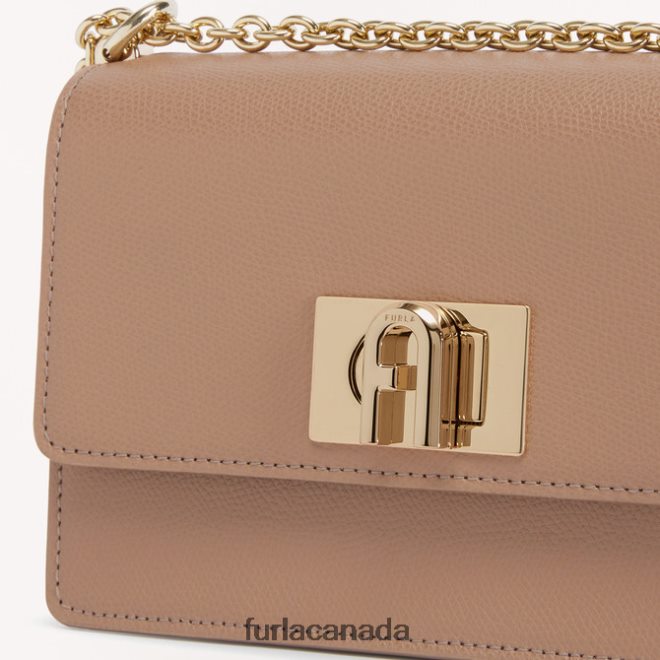 The Furla 1927 mini crossbody bag is made of elegant textured leather with leather strap featuring chain inserts. Perfect to wear also as a shoulder bag; it is characterised by the metal turnstile closure with Furla logo; which makes it practical and functional.