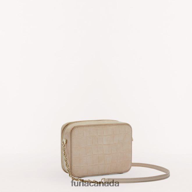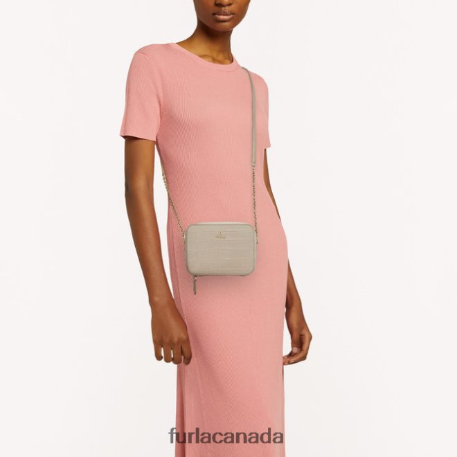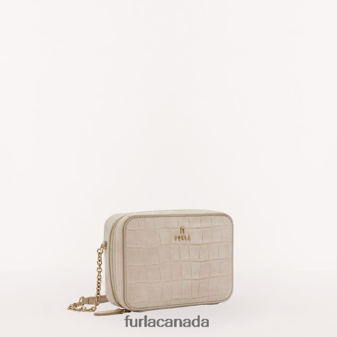 For your trips into the city, the Furla Camelia camera case is the perfect choice. Its small size makes it the ideal companion, whether it is worn crossbody or over the shoulder, and the leather panel on the chain strap adds a shimmering touch to the casual elegance and velvety allure of the luxurious crocodile-effect print nubuck leather.
